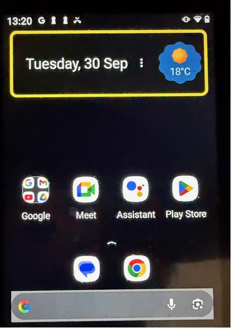 When the SmartVision 3 starts up it does not speak and the normal home screen is not display. The standard Android screen with the Google search box is shown instead, an example is shown below: